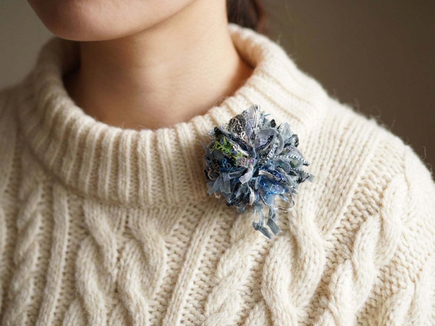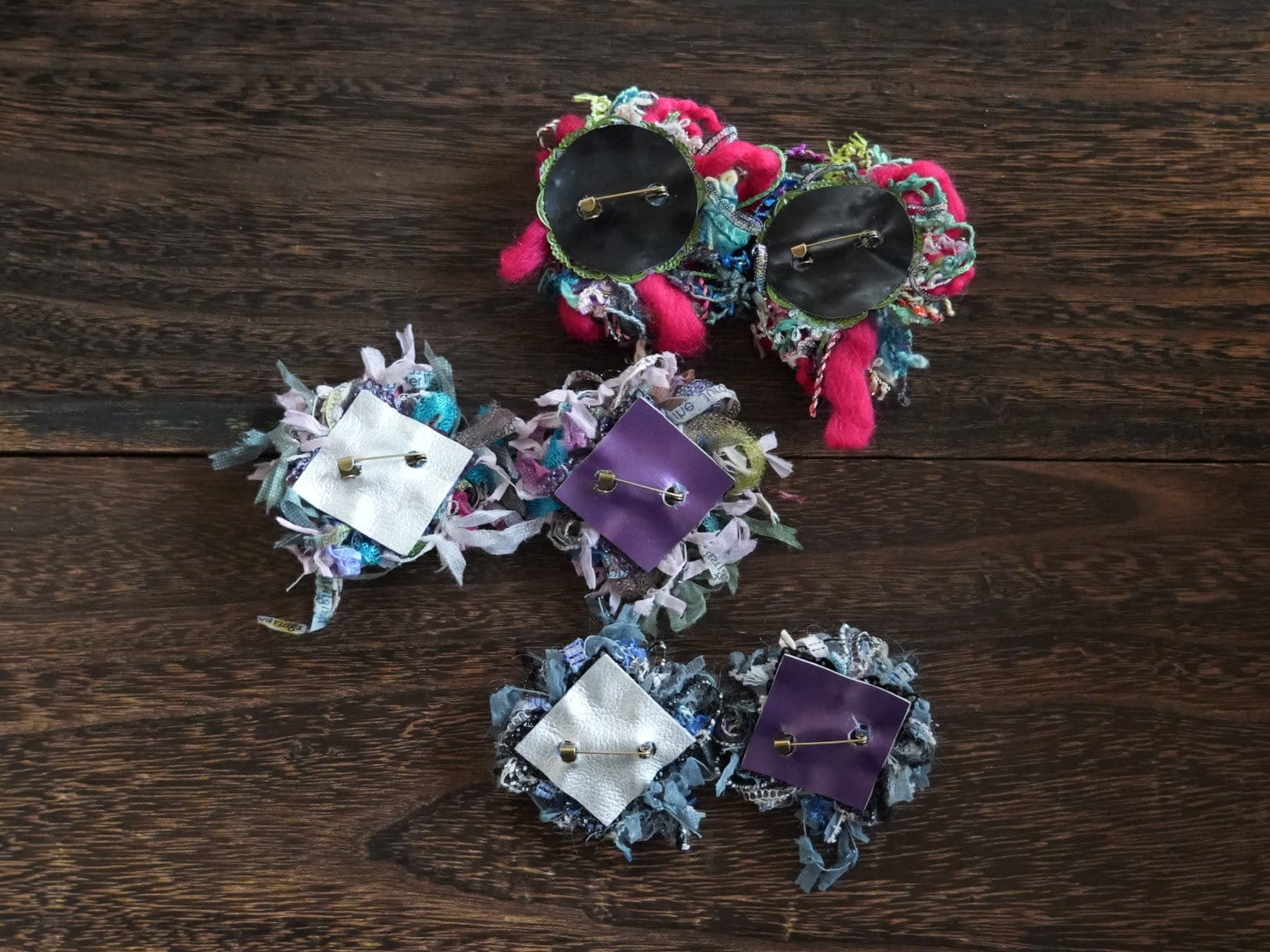 引き揃え糸(毛糸・リボン他)、本革、ブローチピン 使用