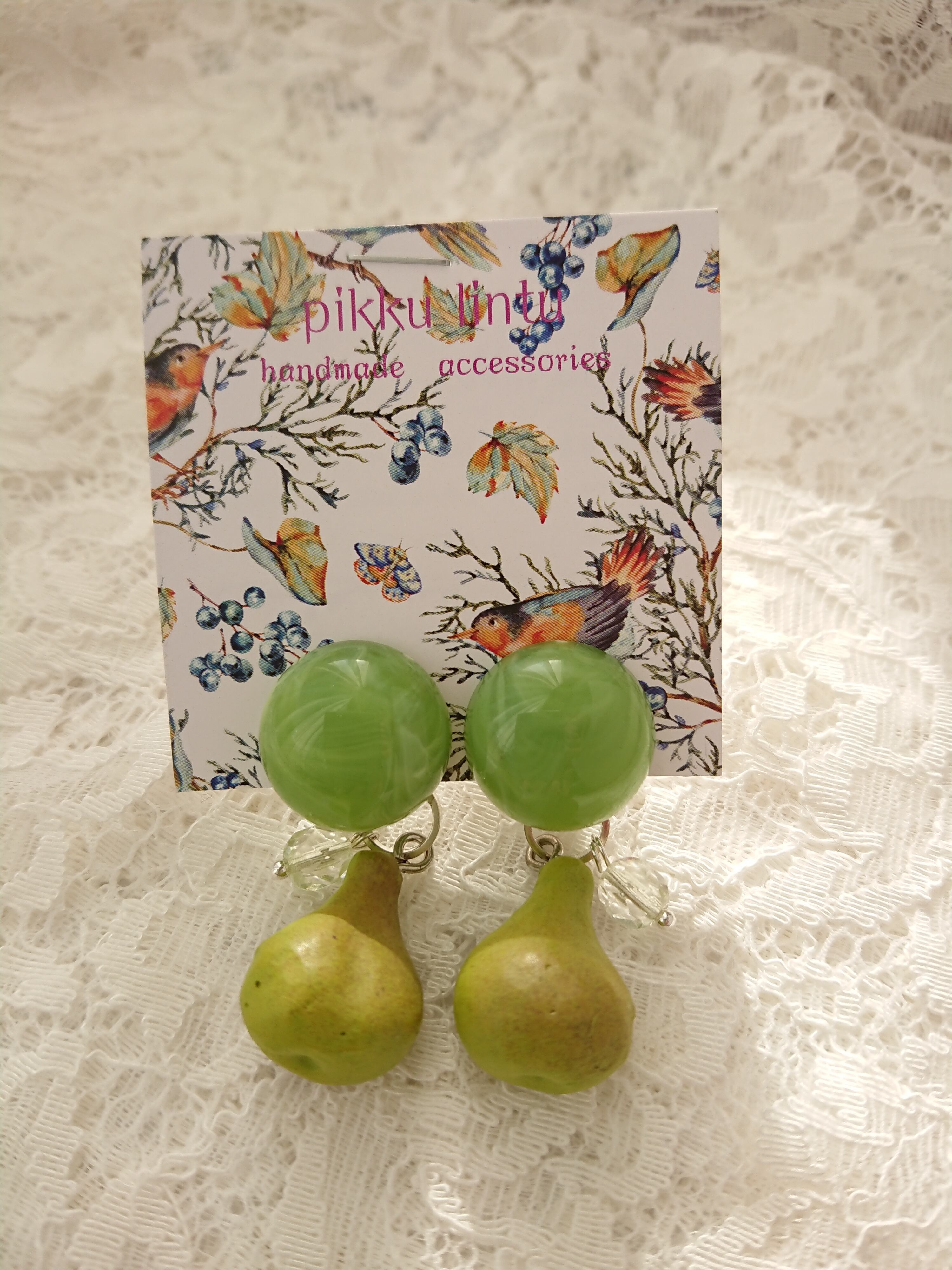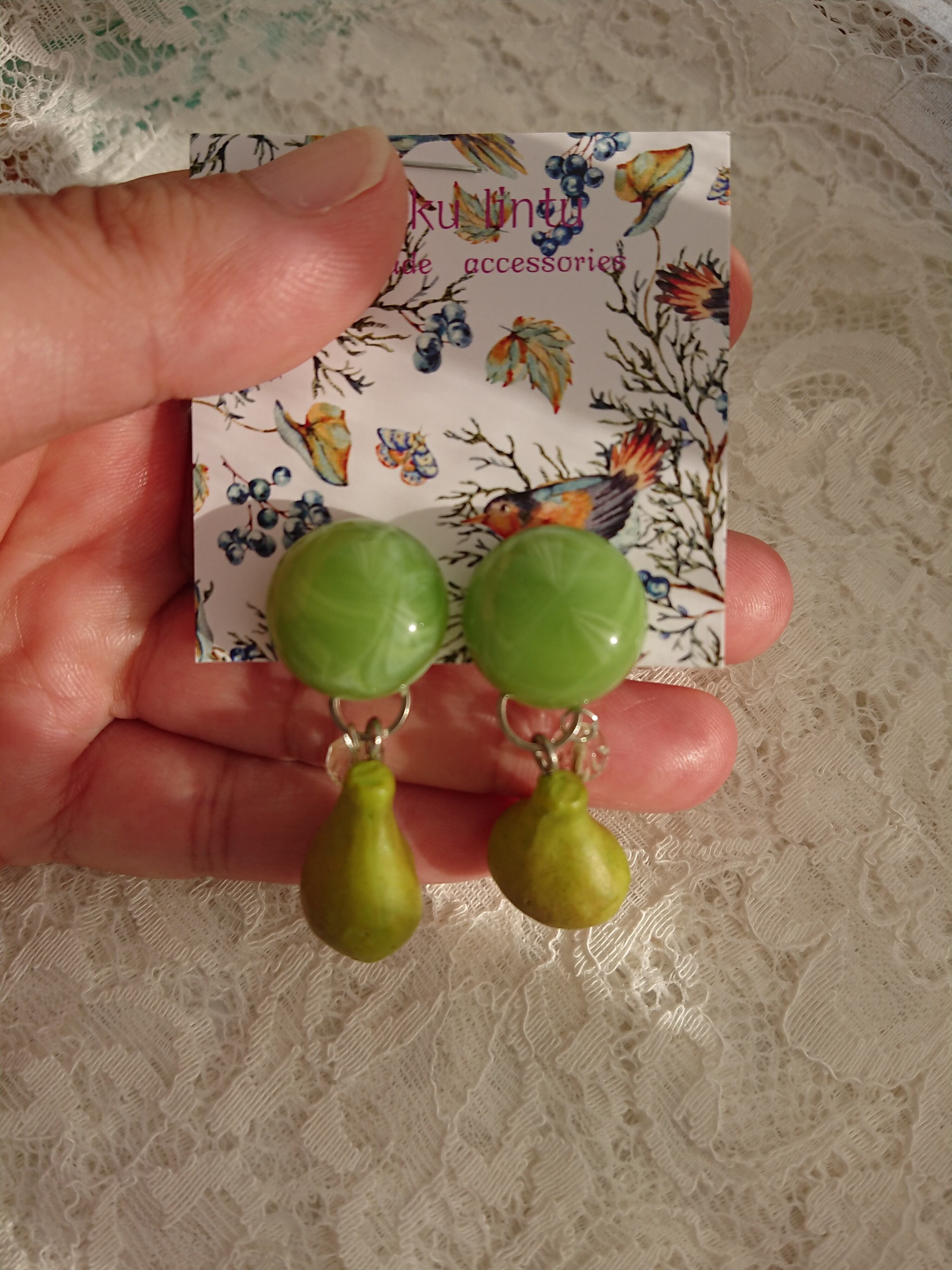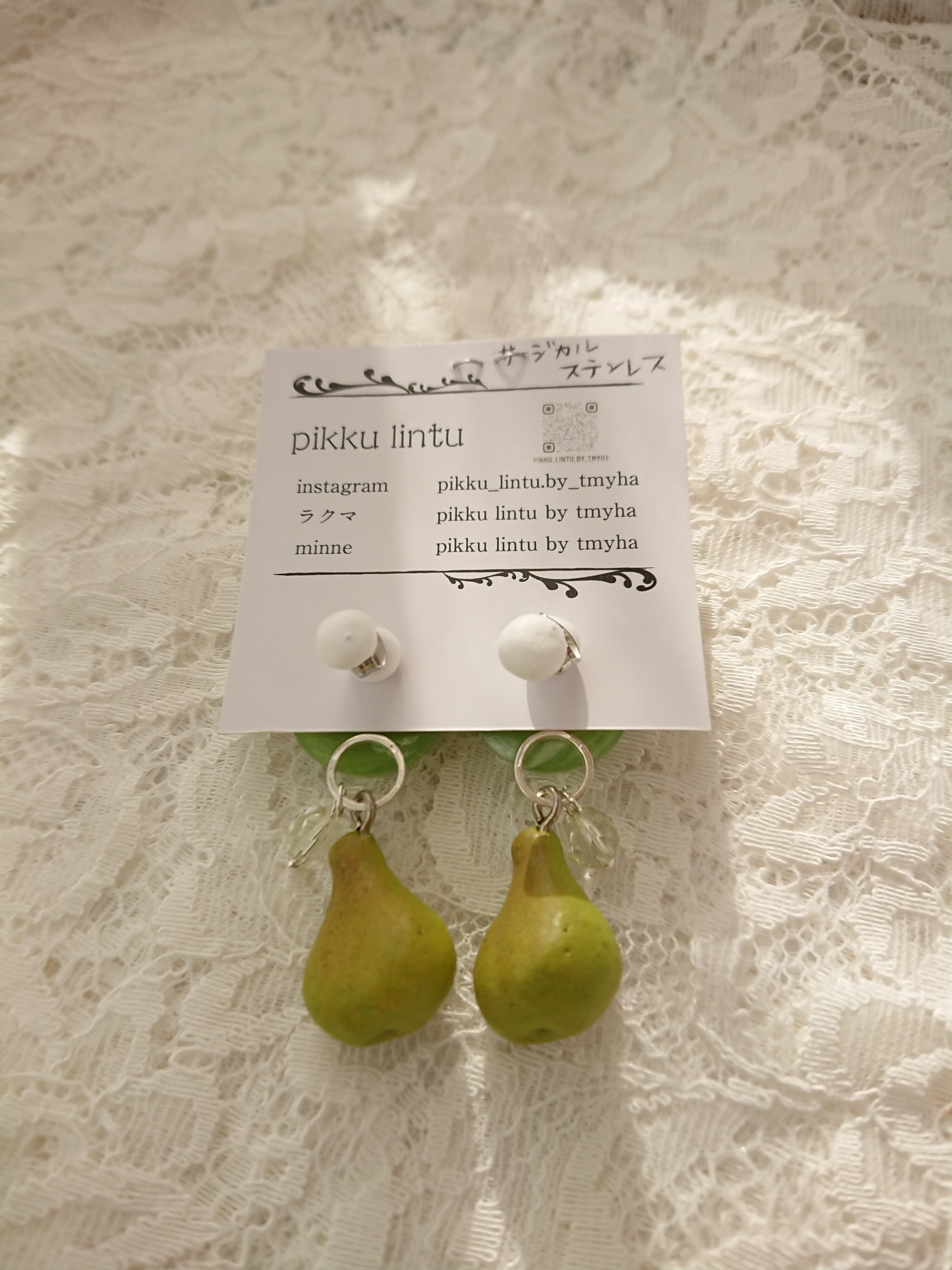 梨のパーツが焼物のような、陶磁器のような、プラスチックではない素材なので、高級感がある代わり、重さが多少あります。(一般的な大きめのピアスくらい)