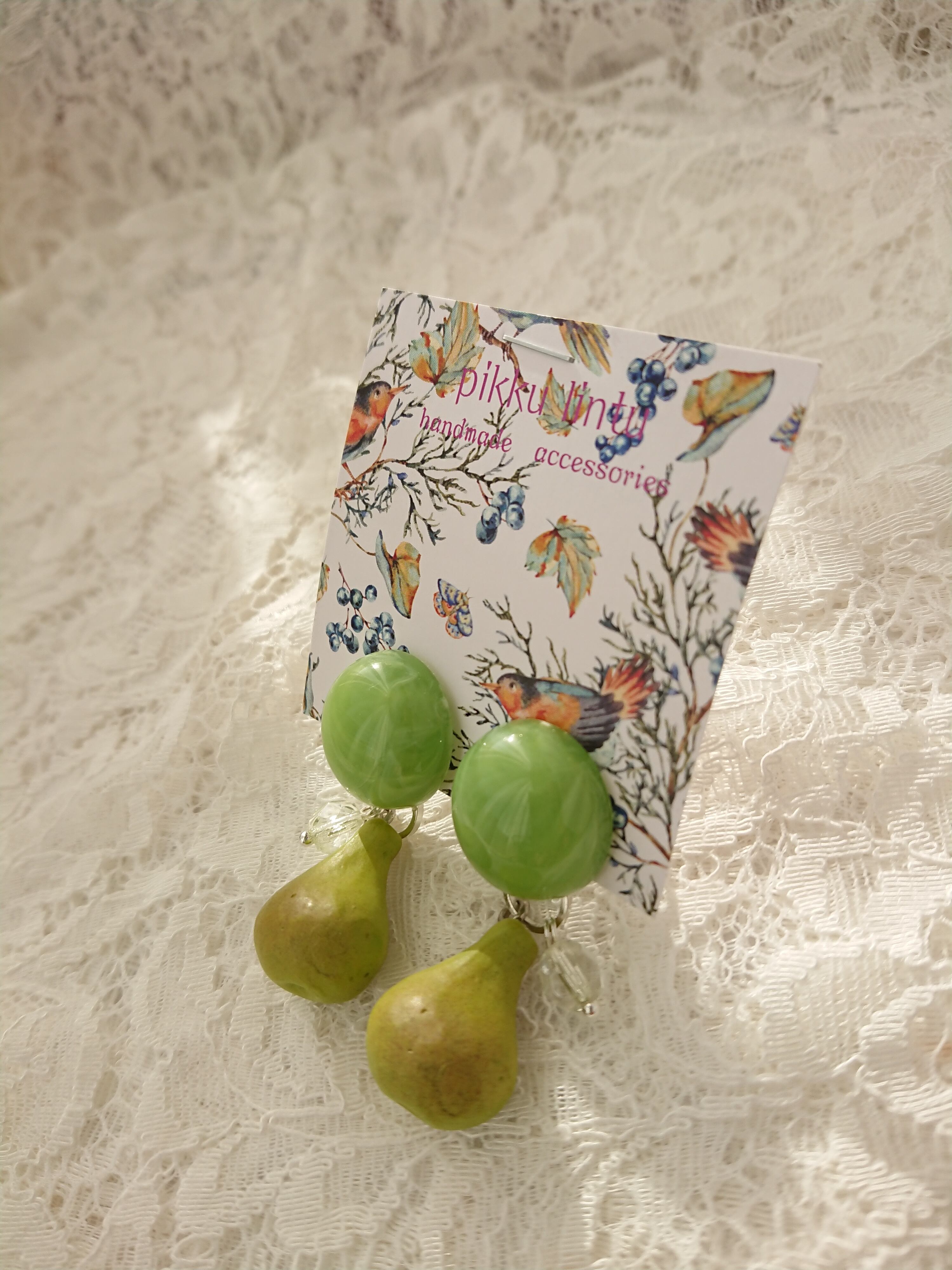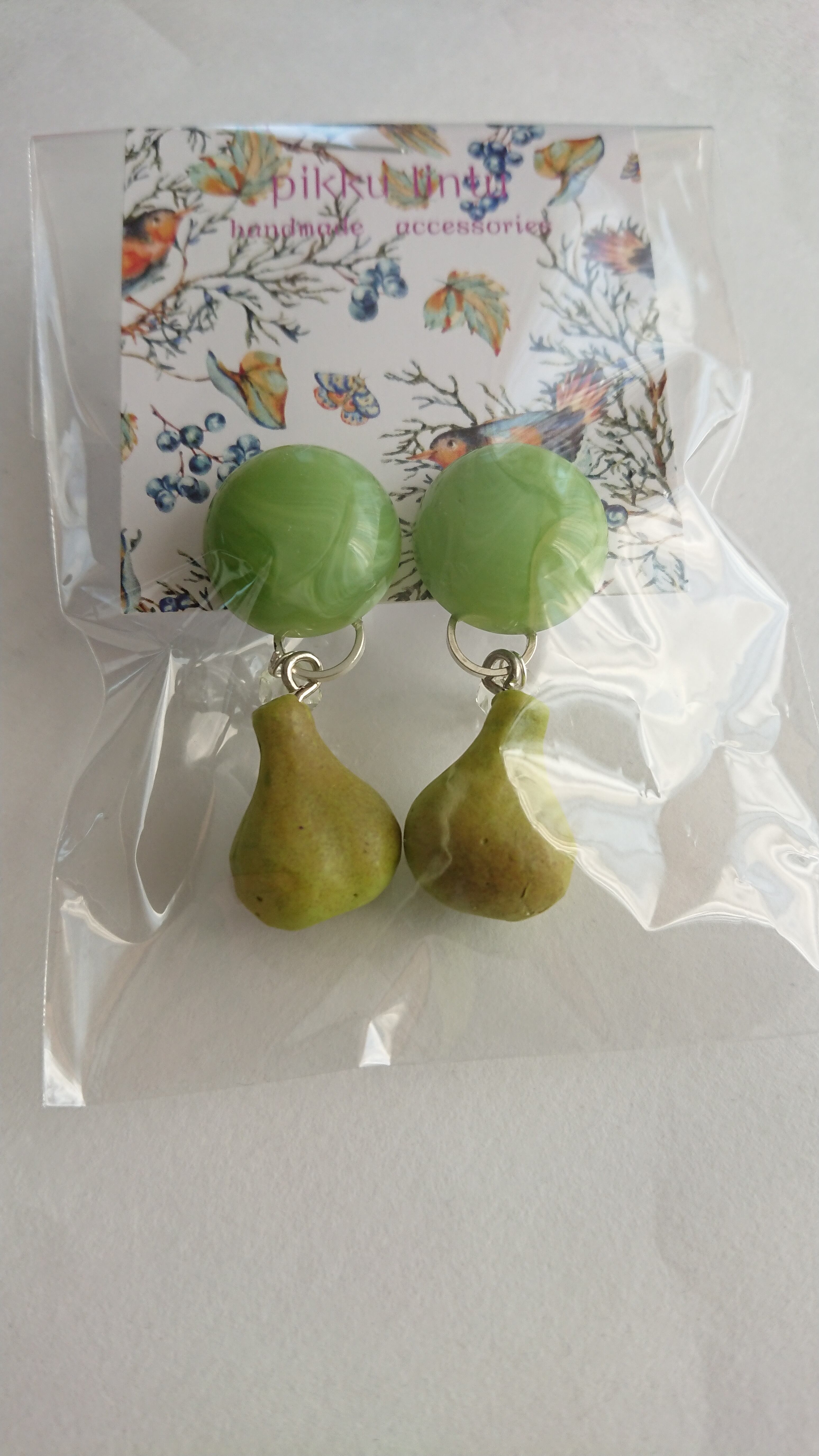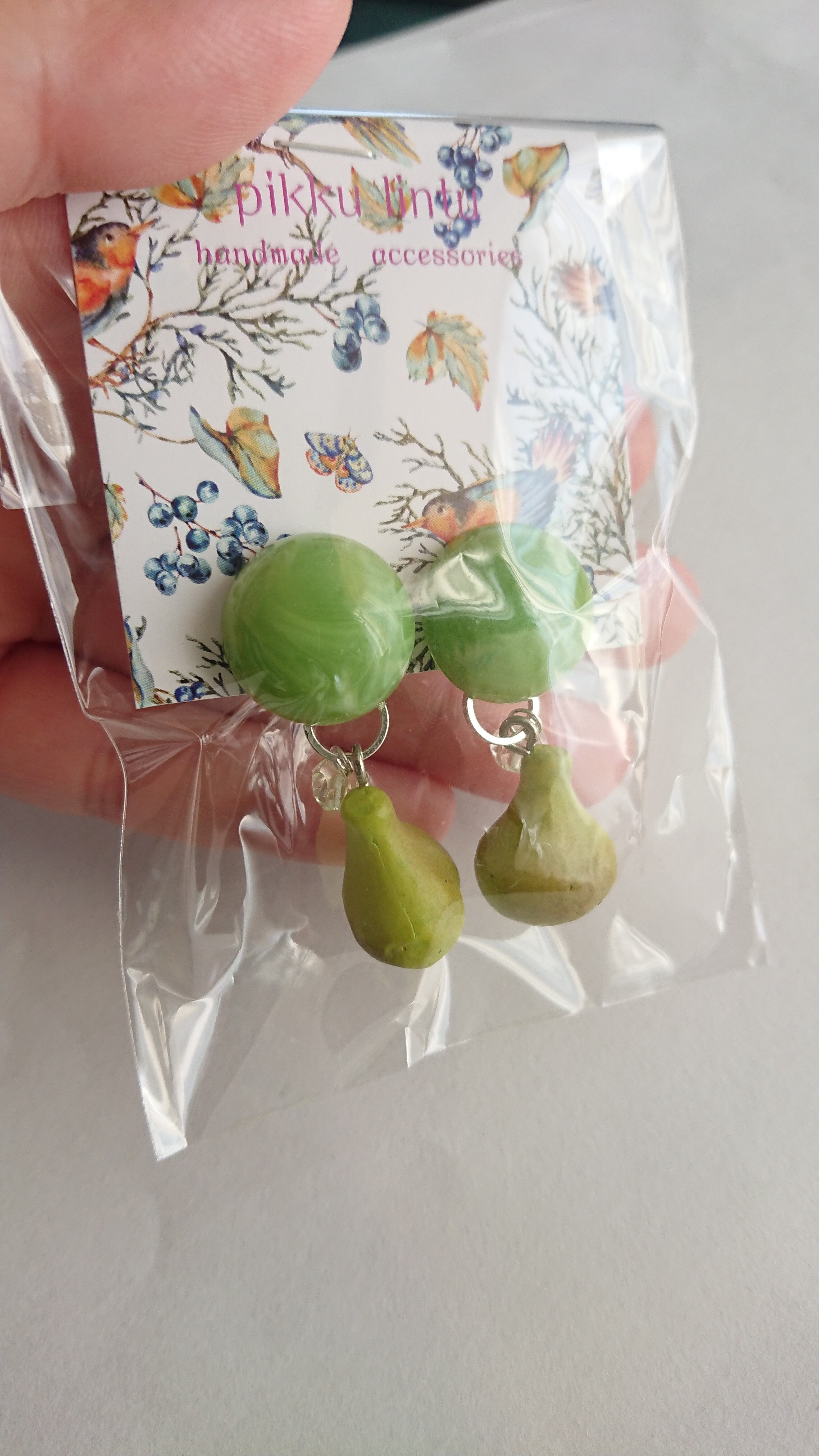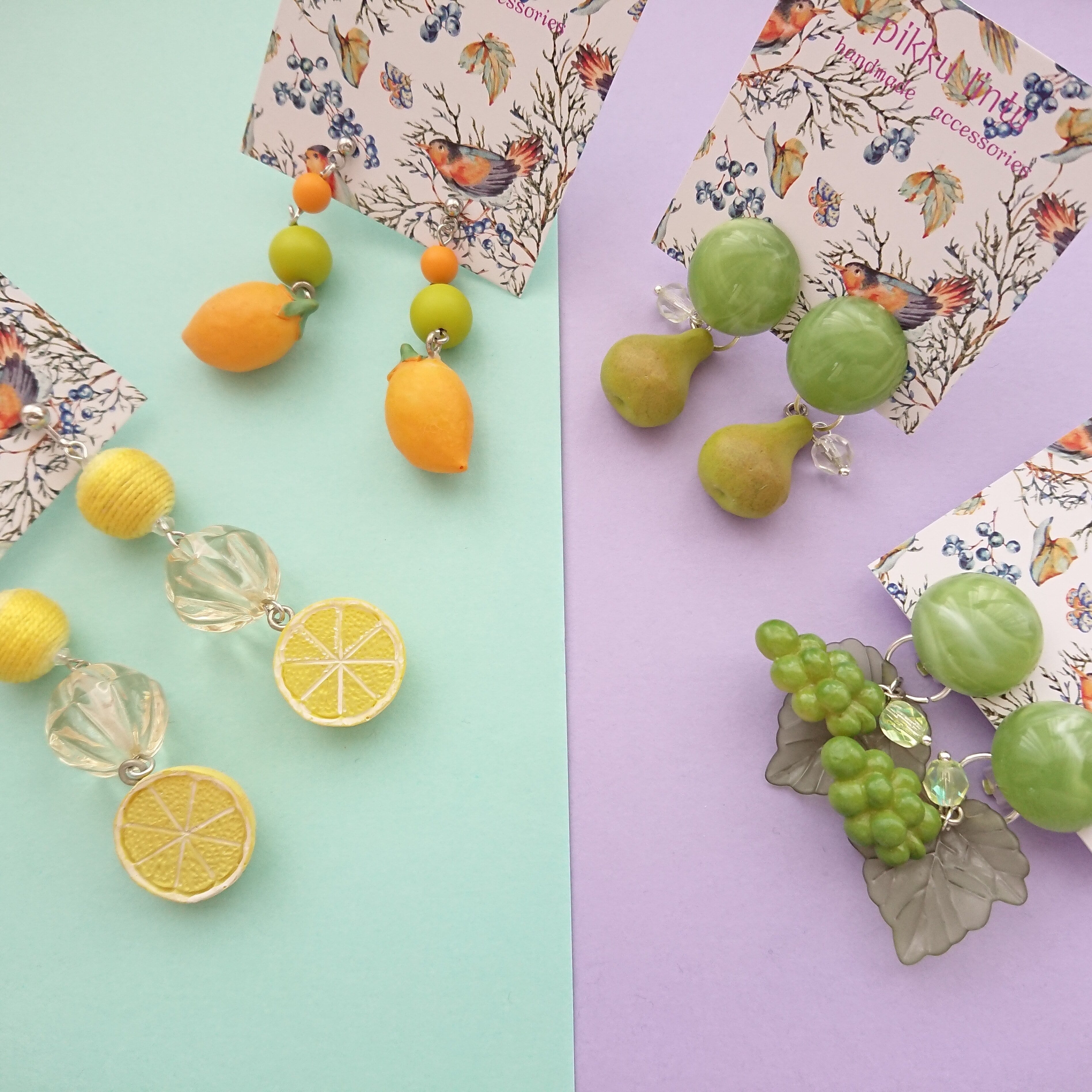 梨のパーツが焼物のような、陶磁器のような、プラスチックではない素材なので、高級感がある代わり、重さが多少あります。(一般的な大きめのピアスくらい)
