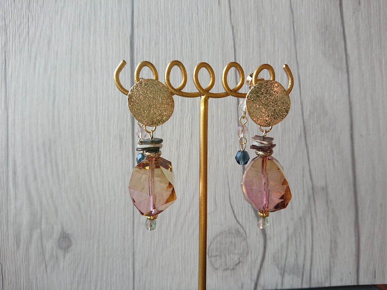 他にも、シェルやフランス製の勤続パーツ、茶色の天然石をさりげなく、アクセントにあしらっております。