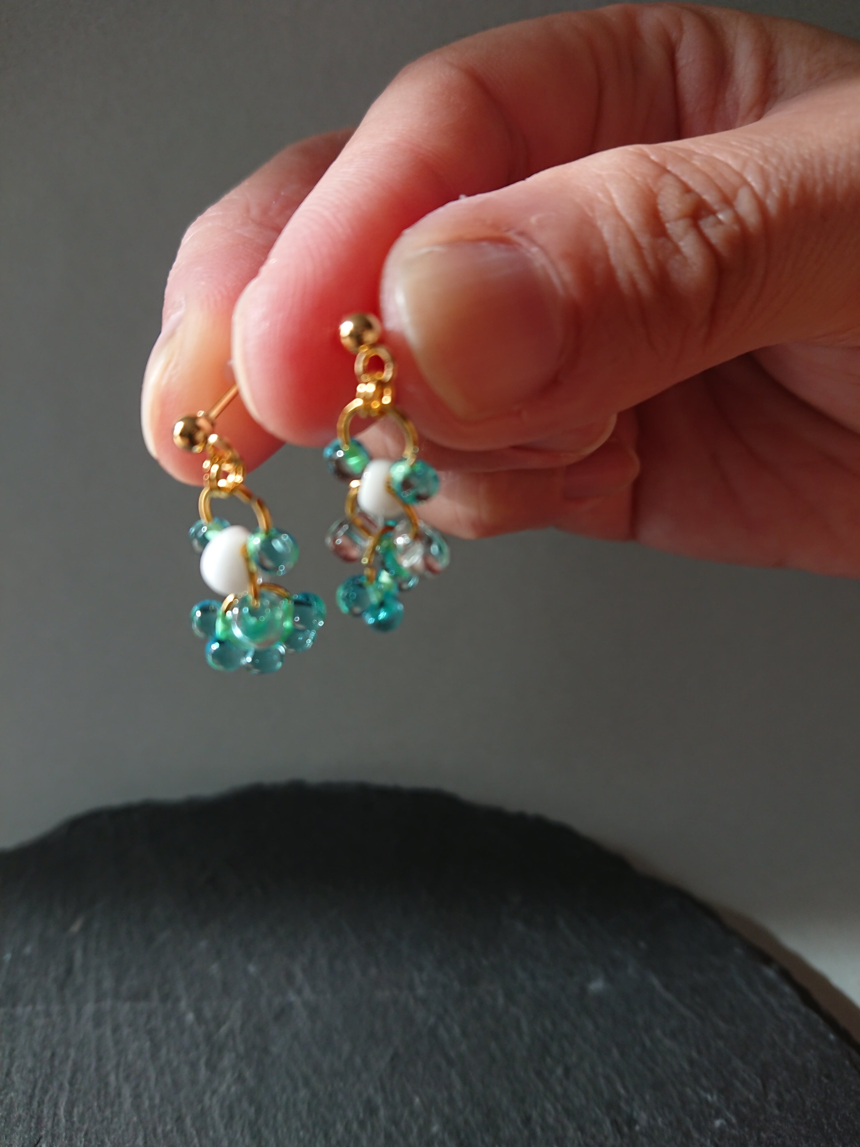 しずく型のクリアな水色・白の2色のビーズを連ねて表現しました。