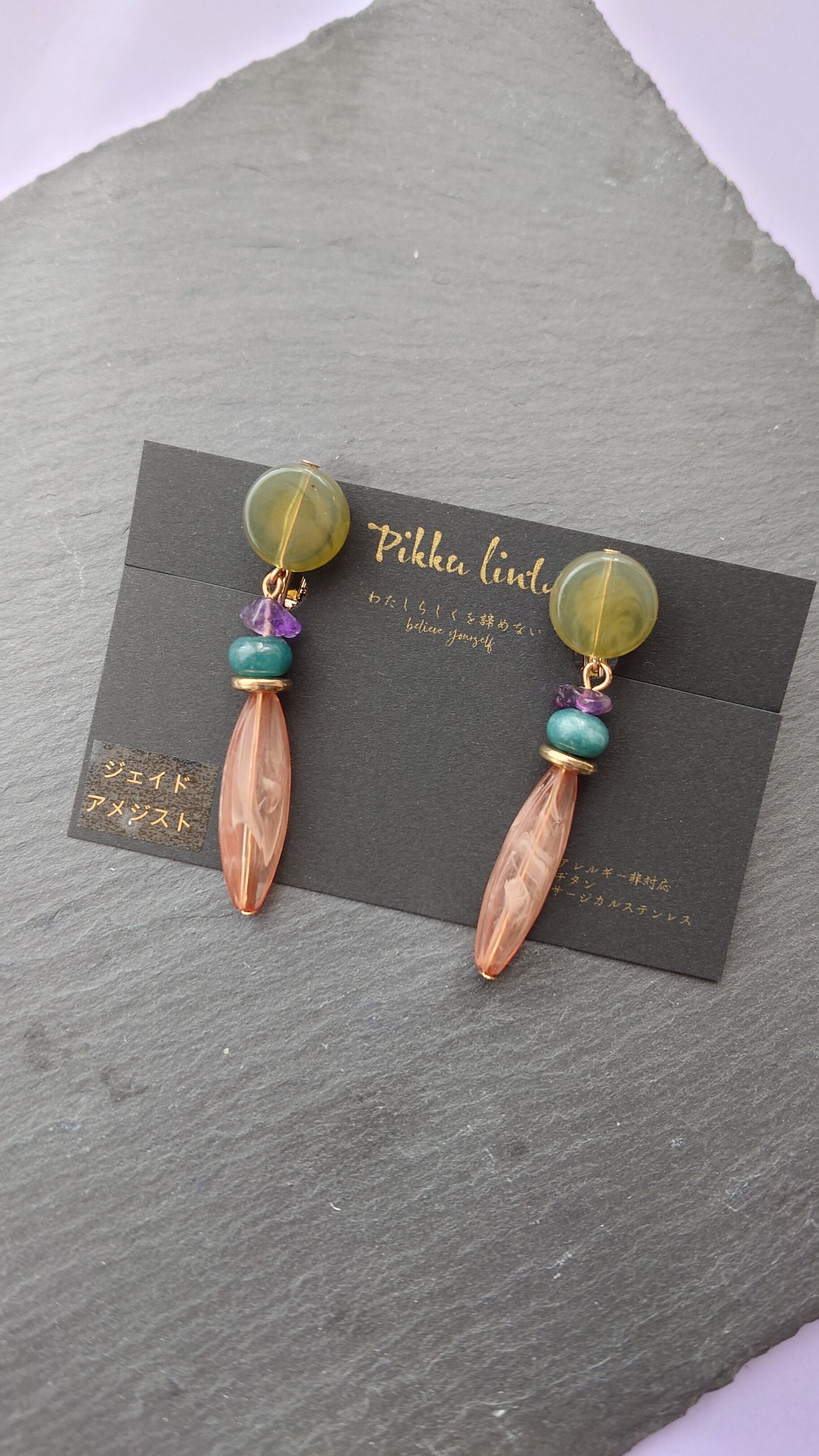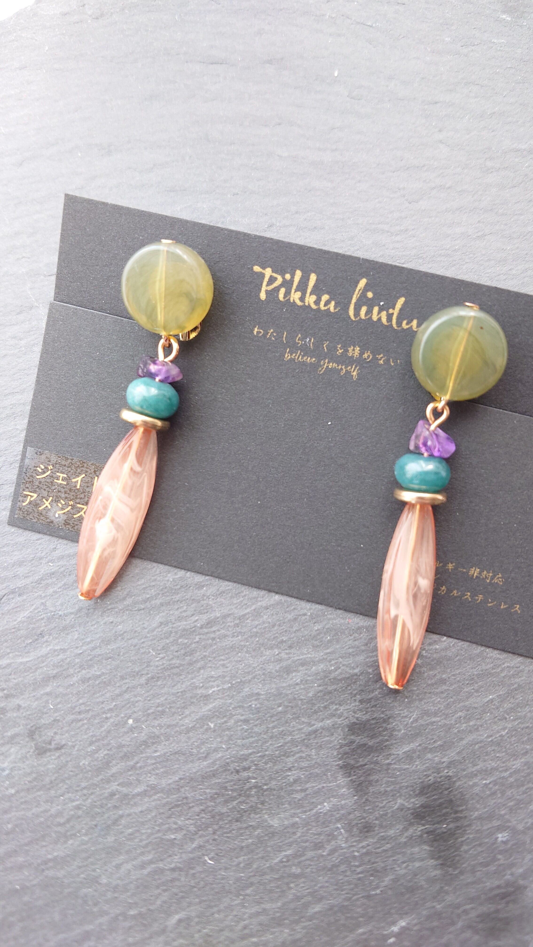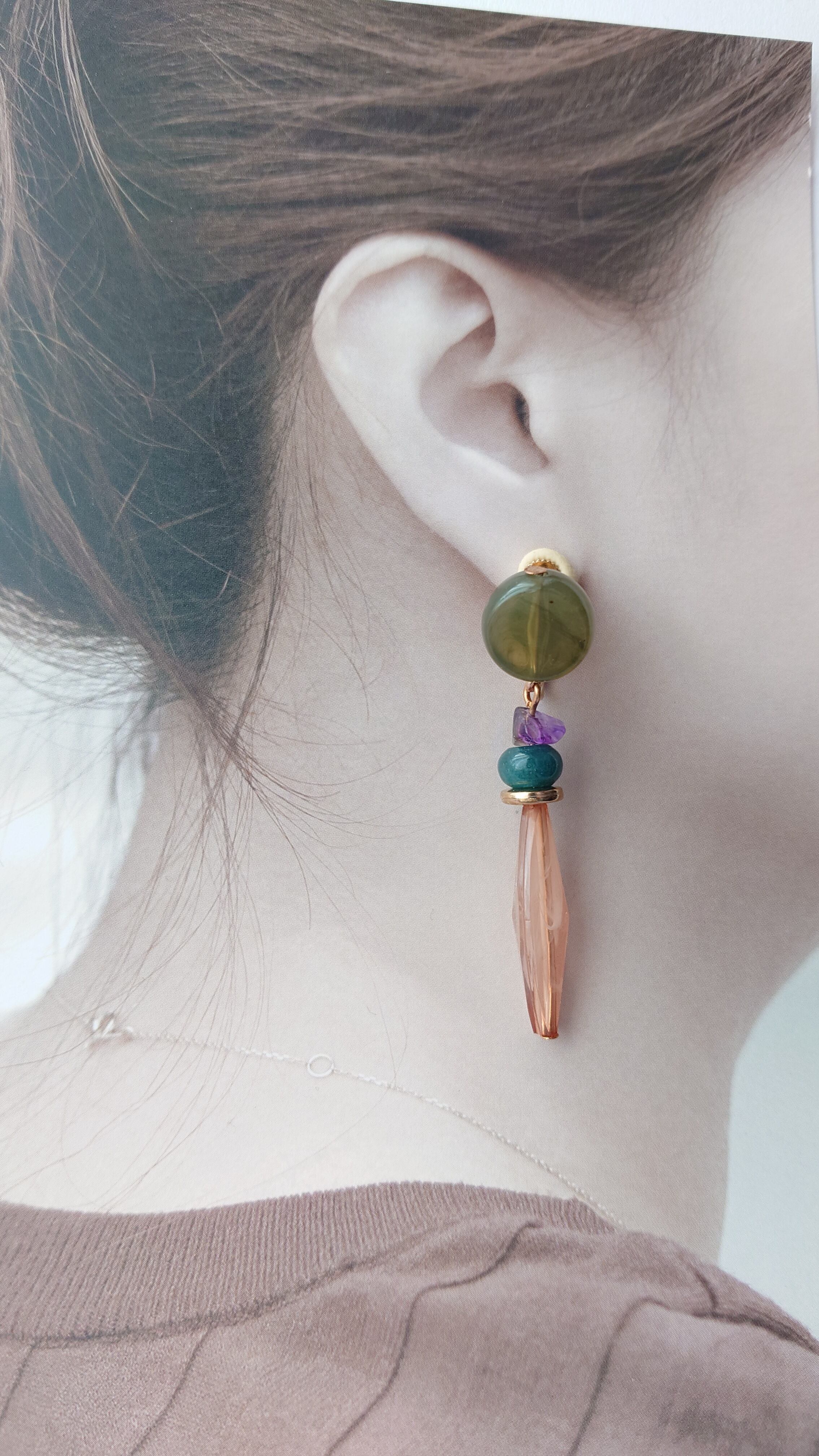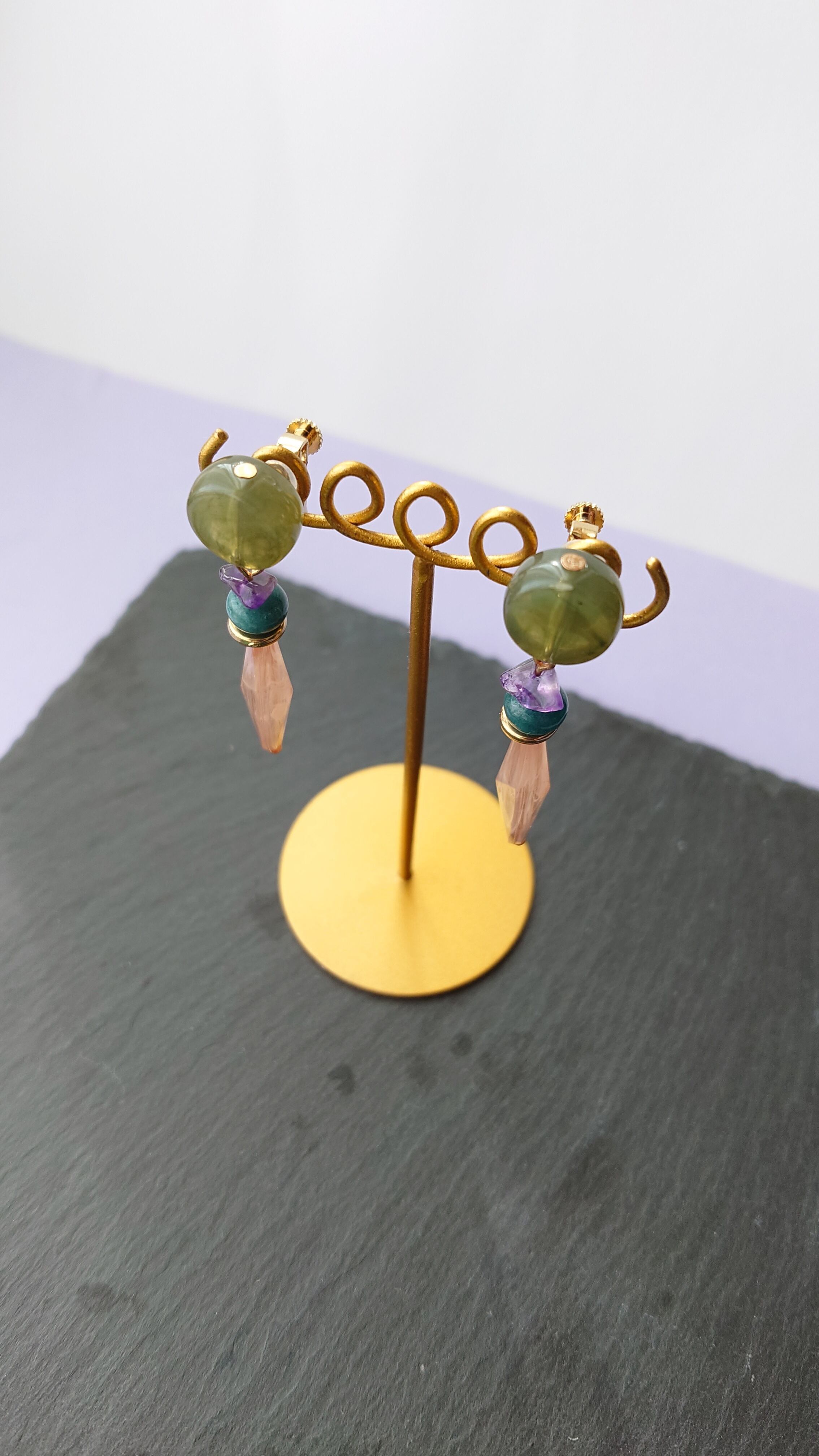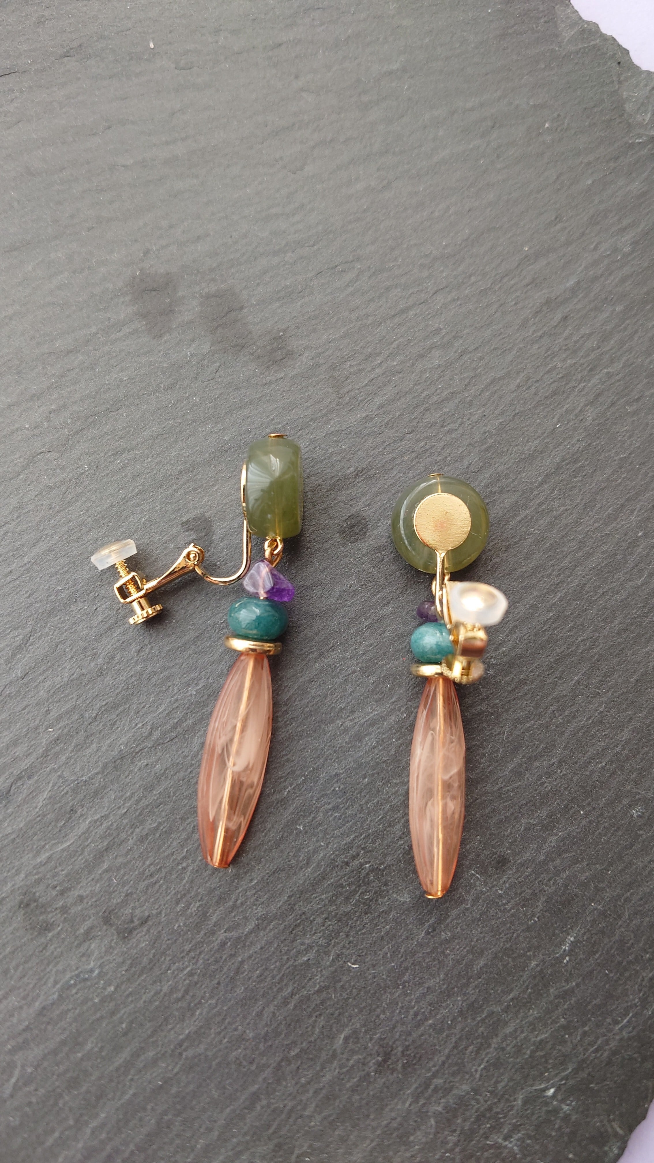 ブラウン×グリーン×パープル さり気ない天然石の上質さを愉しむ 大人カラーのヴィンテージテイスト イヤリング