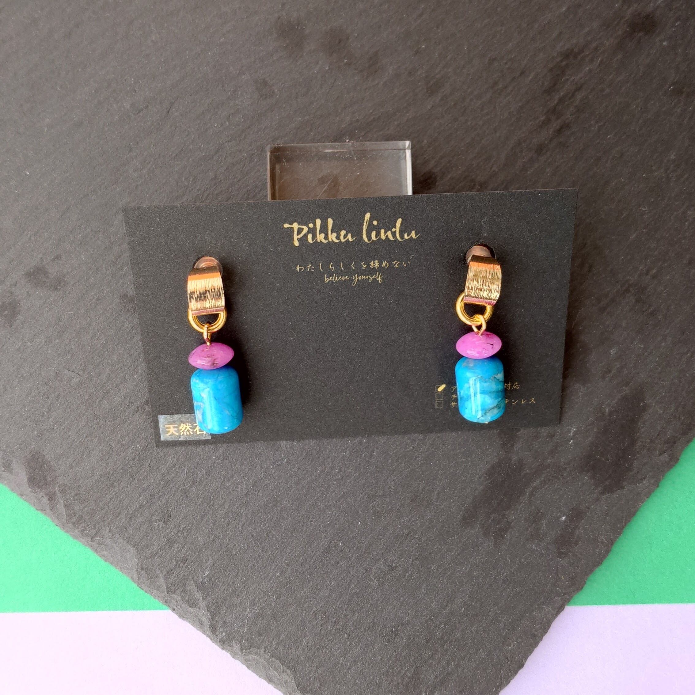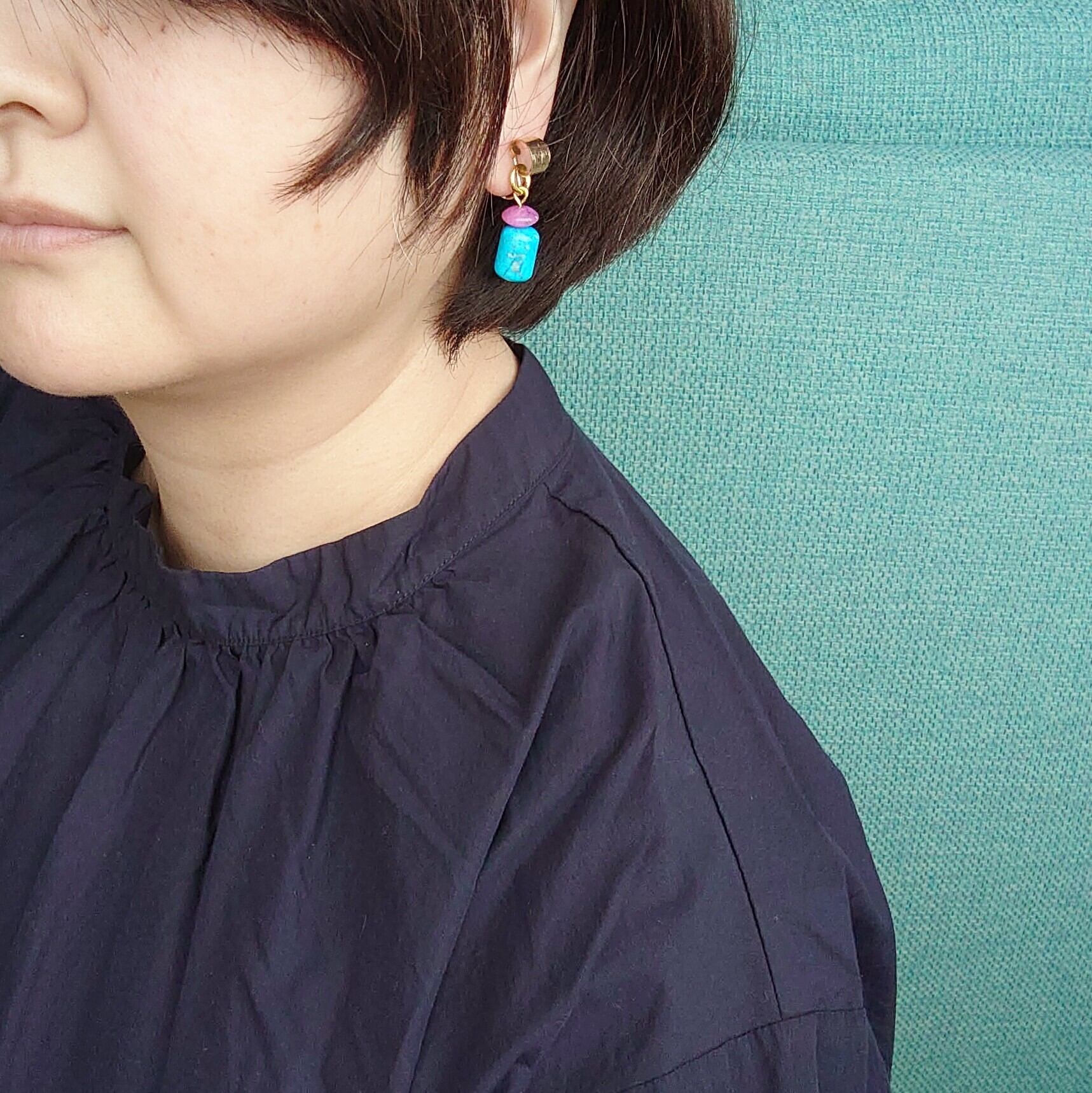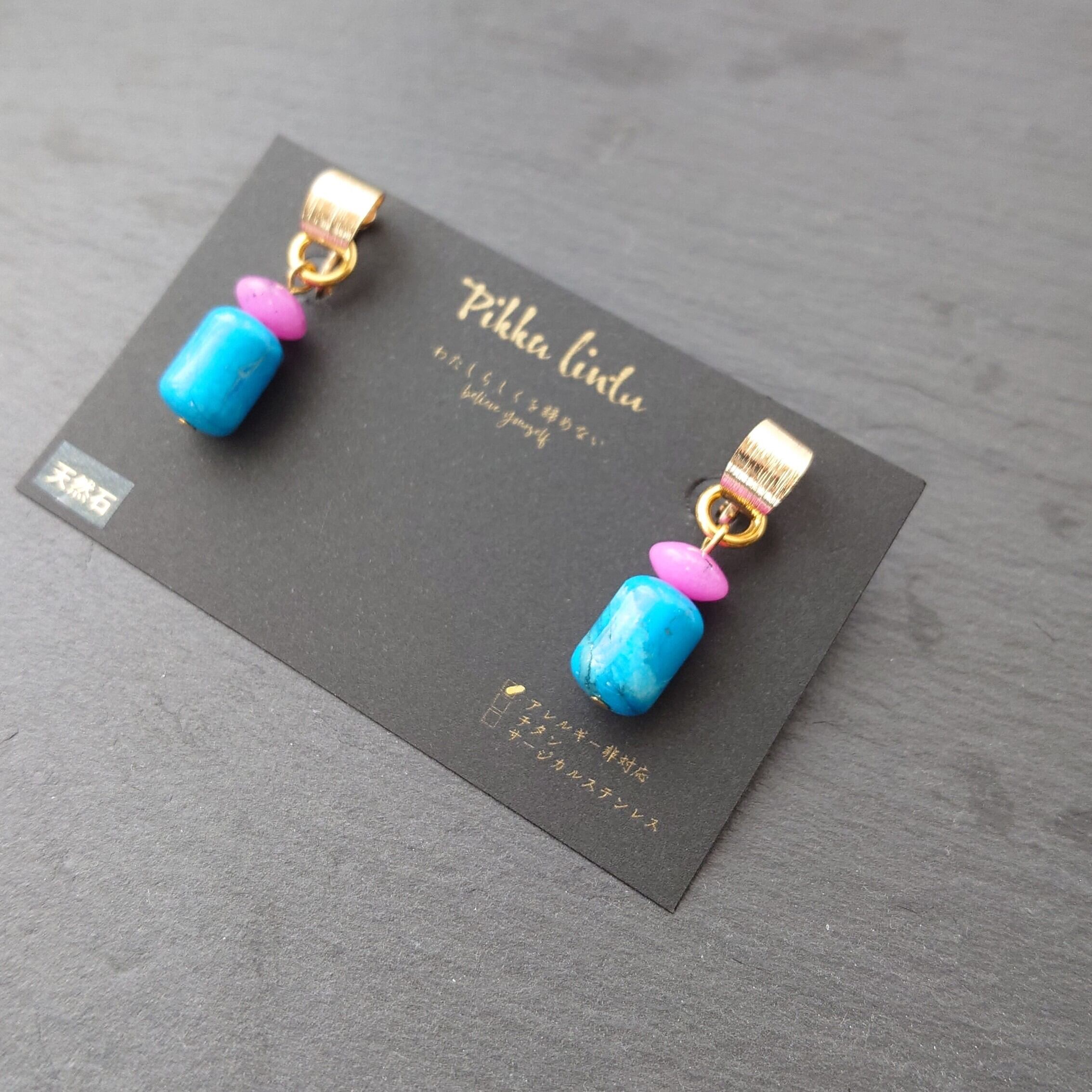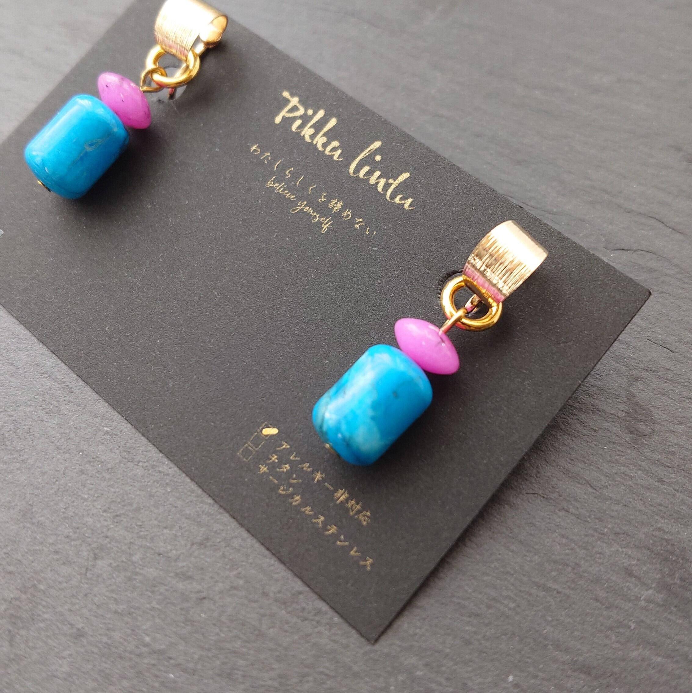 鮮やかブルーとピンクの天然石 ヴィンテージテイストイヤリング