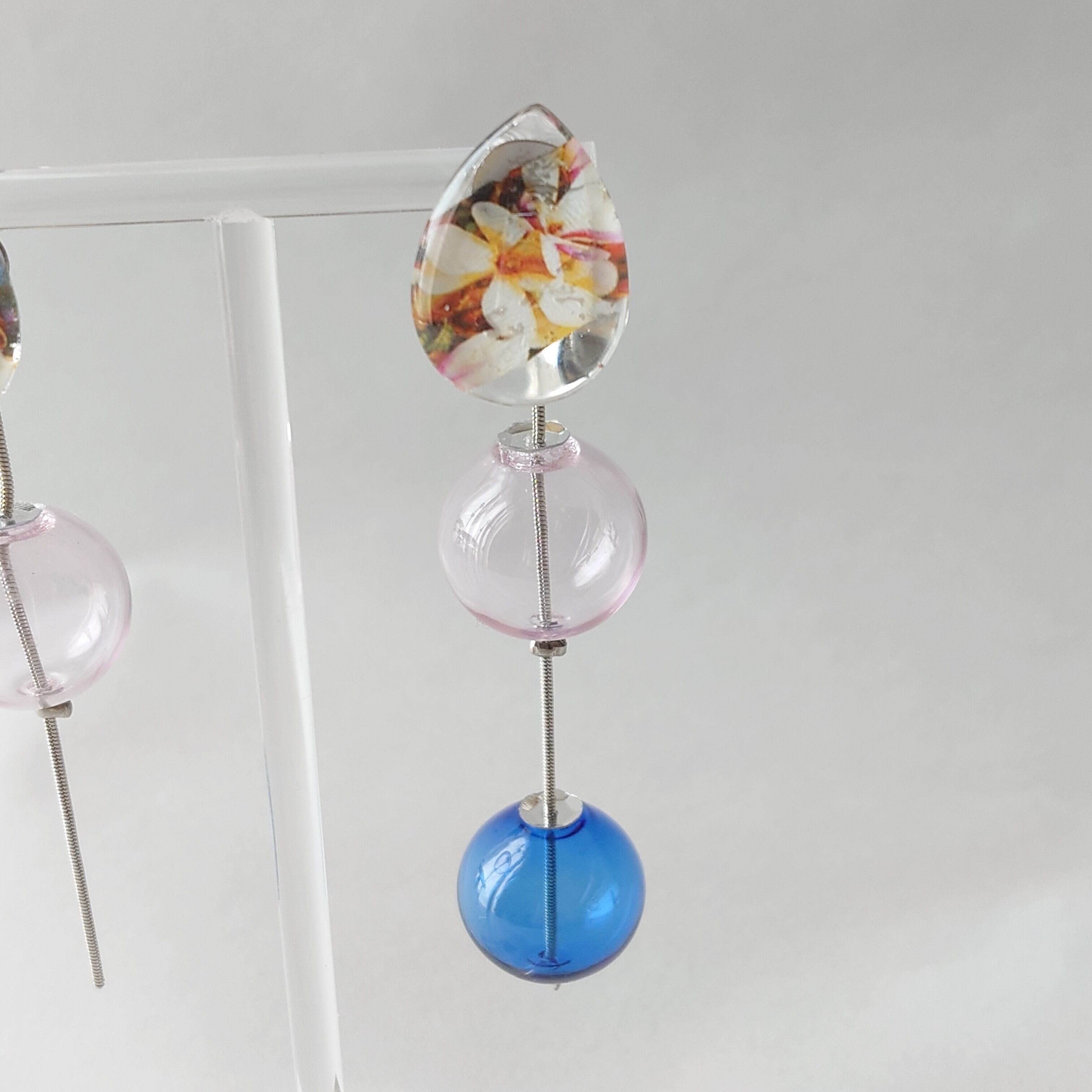 耳元の金具部分は、透明のガラスに独自に柄を付けています。