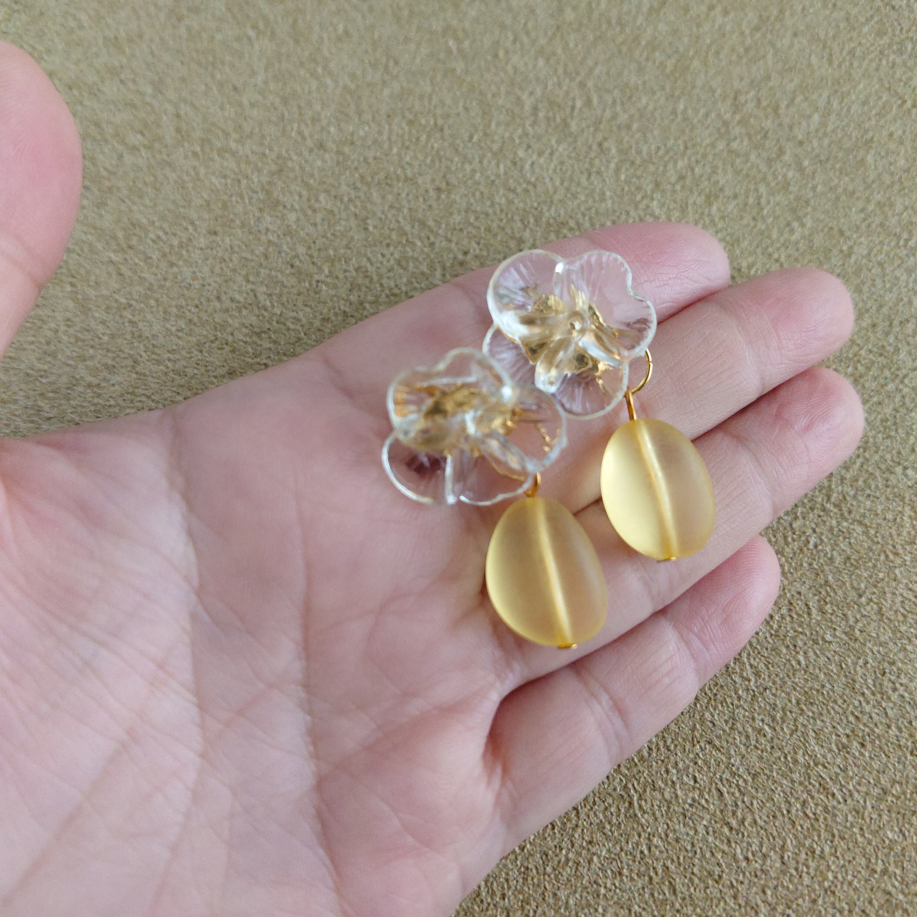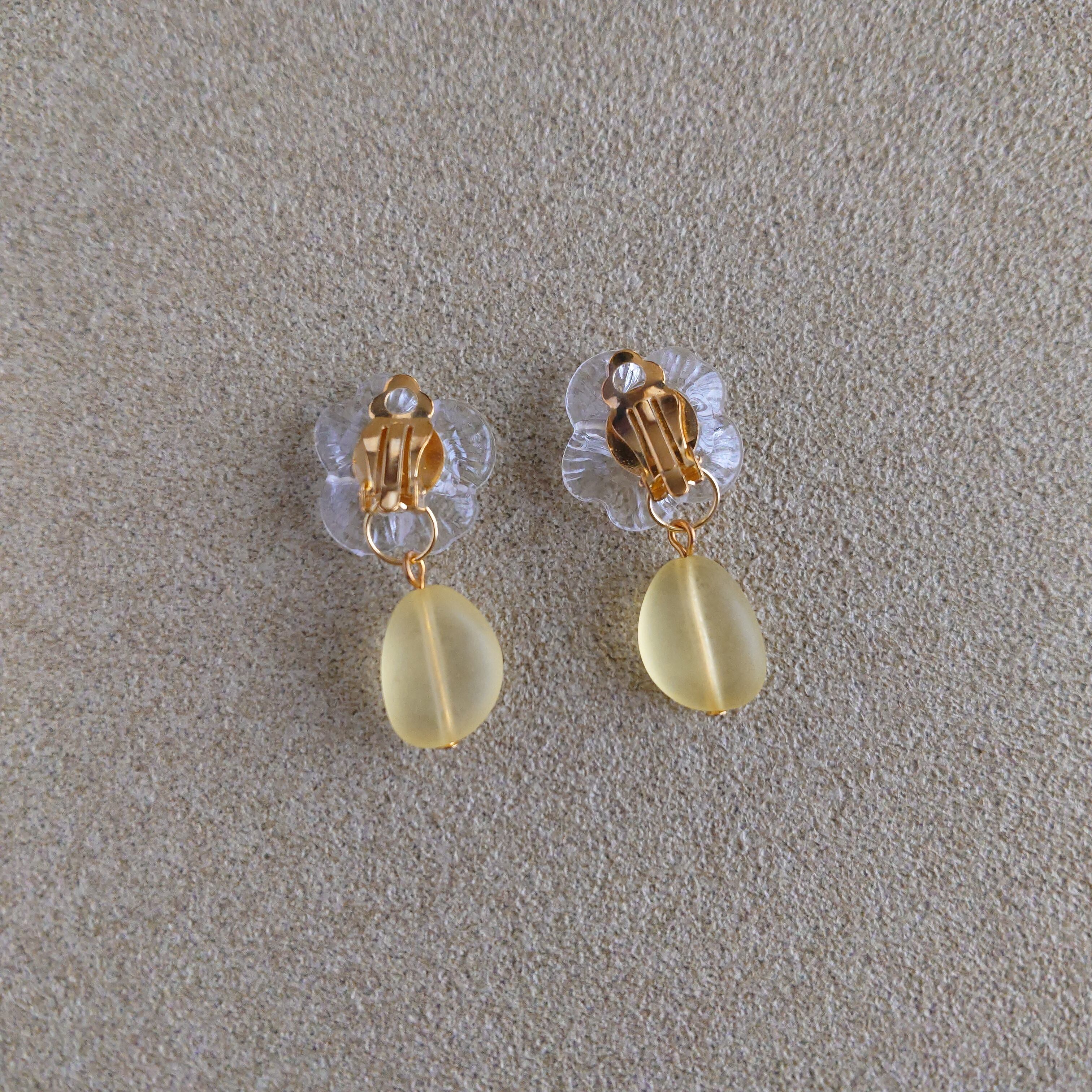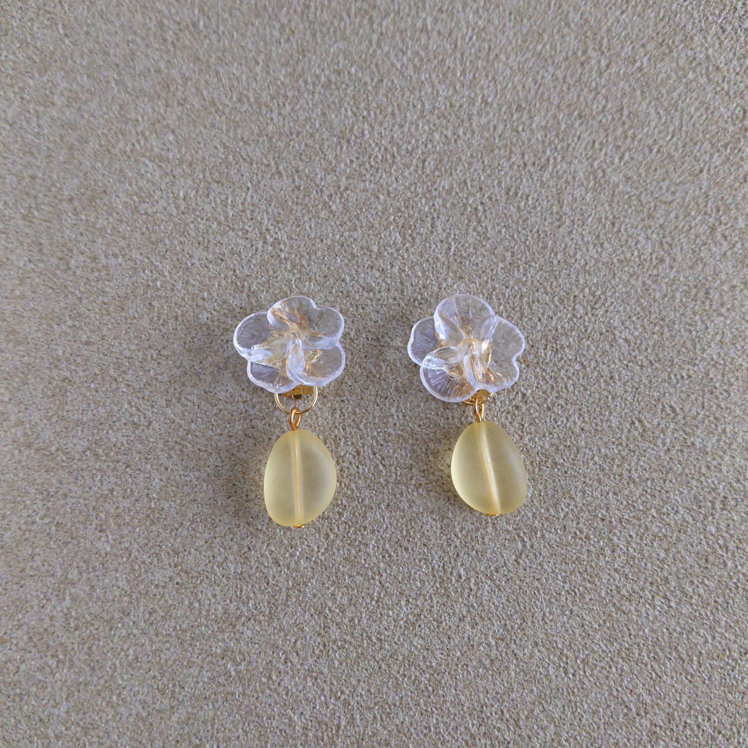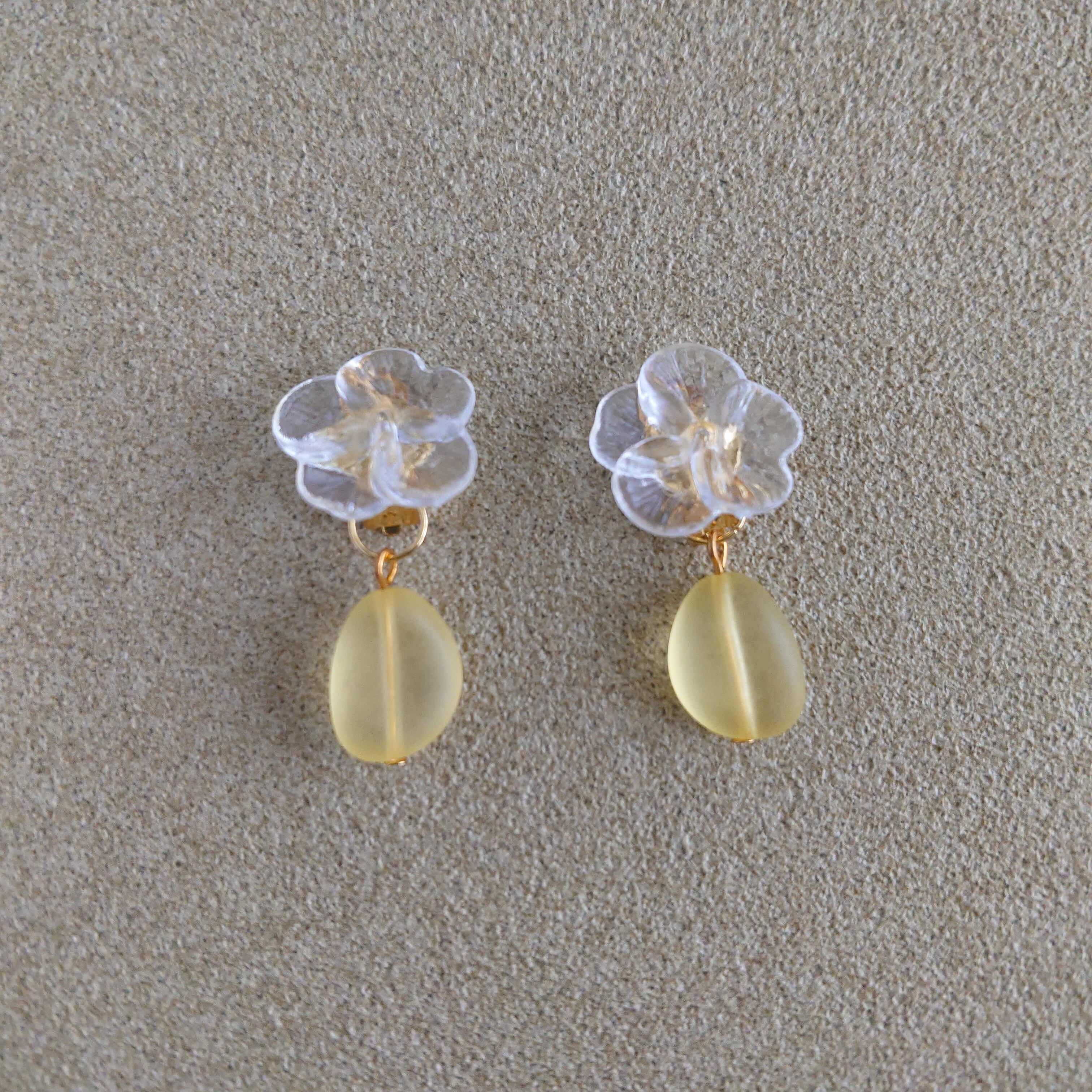 クリアなお花に、明るく爽やかなイエローが織りなす、可愛らしさと上品さを併せ持ったイヤリングです。